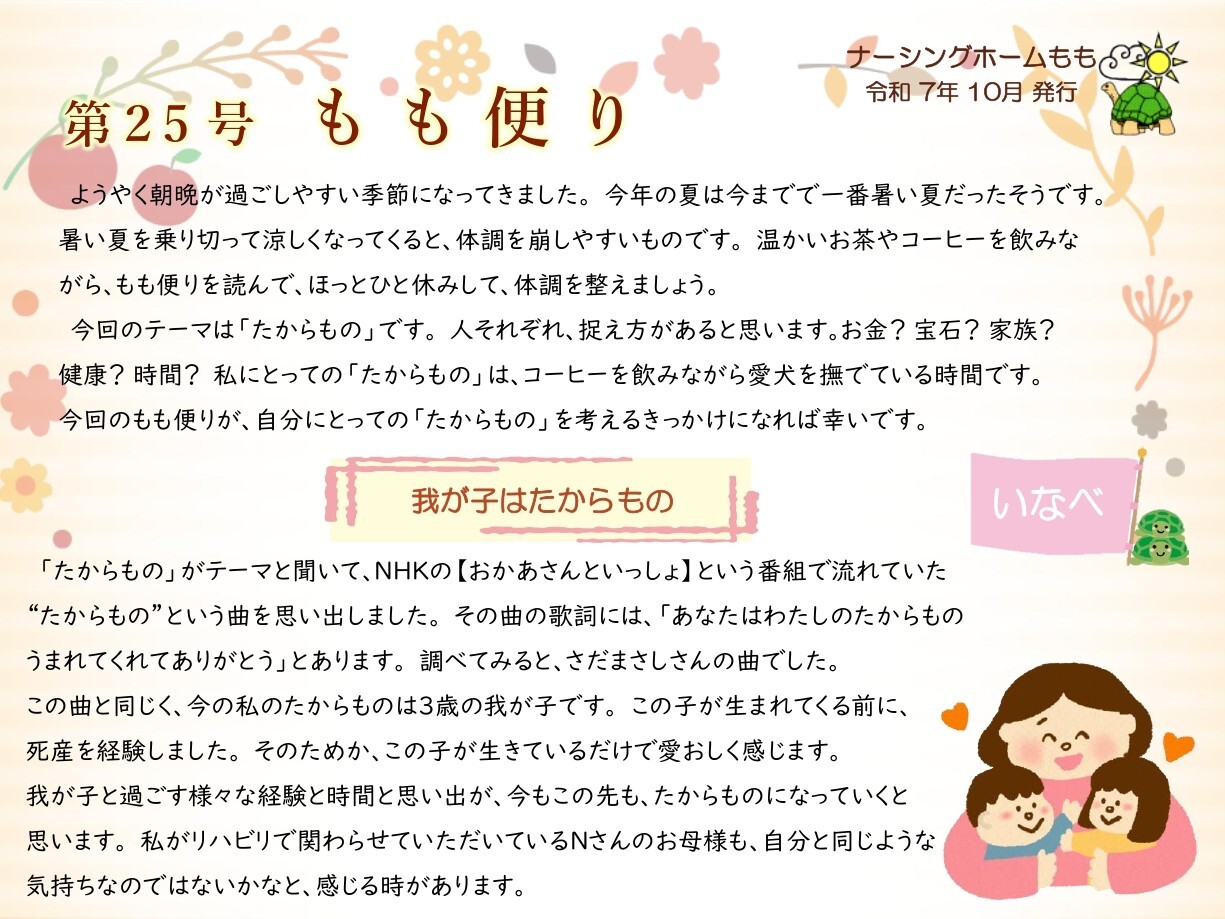 ナーシングホームももでは、平成30年2月から、各事業所の特徴やスタッフの想いが伝わるような記事、さらには地域に密着した情報の発信を目指して、年3回『もも便り』を発行しております。